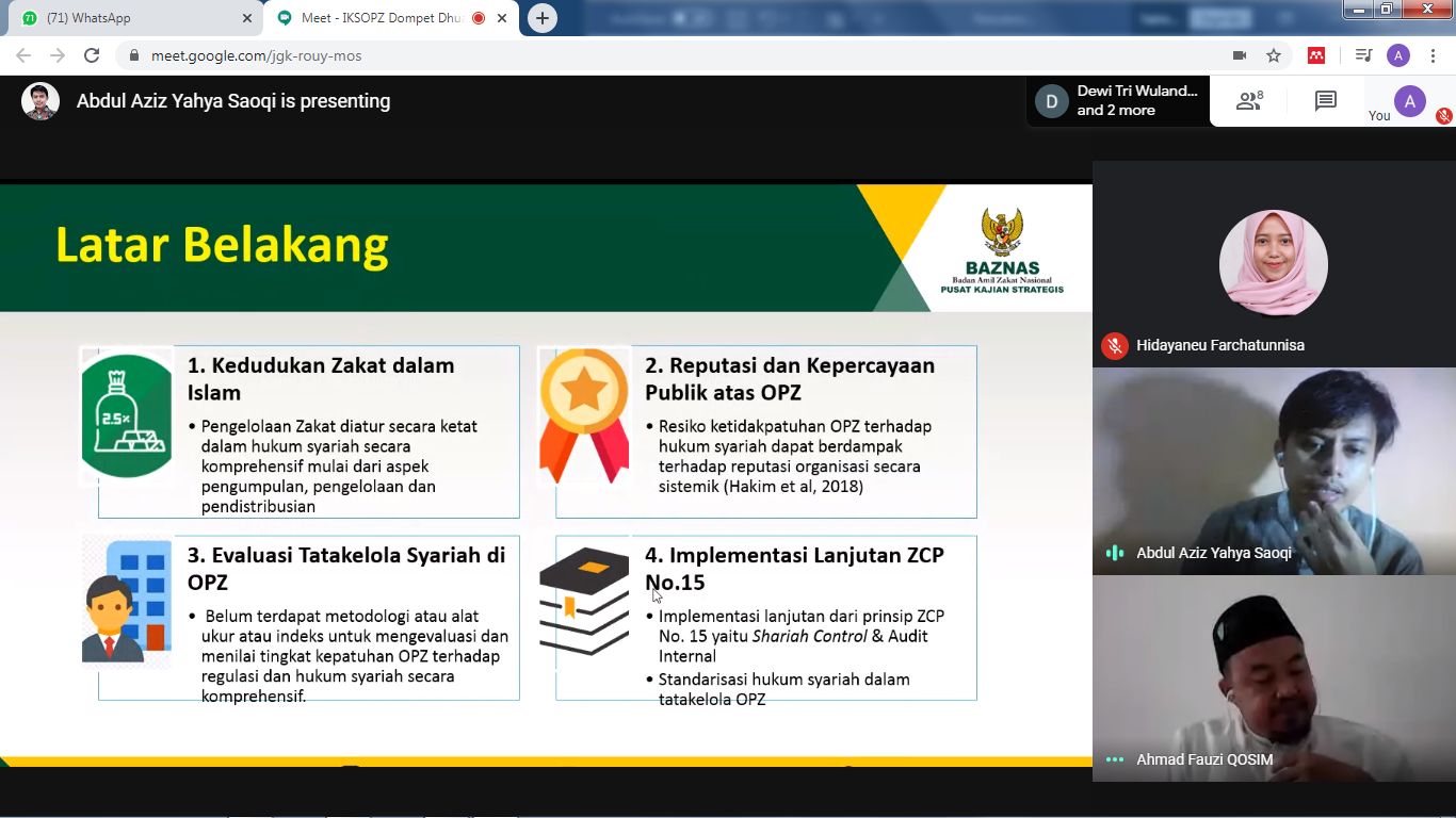 On Monday (23/03) and Tuesday (24/3) Puskas BAZNAS held their second online meeting for the implementation of the Shariah Compliance Index Pilot Project. The first online meeting focused three regional BAZNAS as the respondents. The second online meeting focused on zakat shariah compliance management in LAZ.