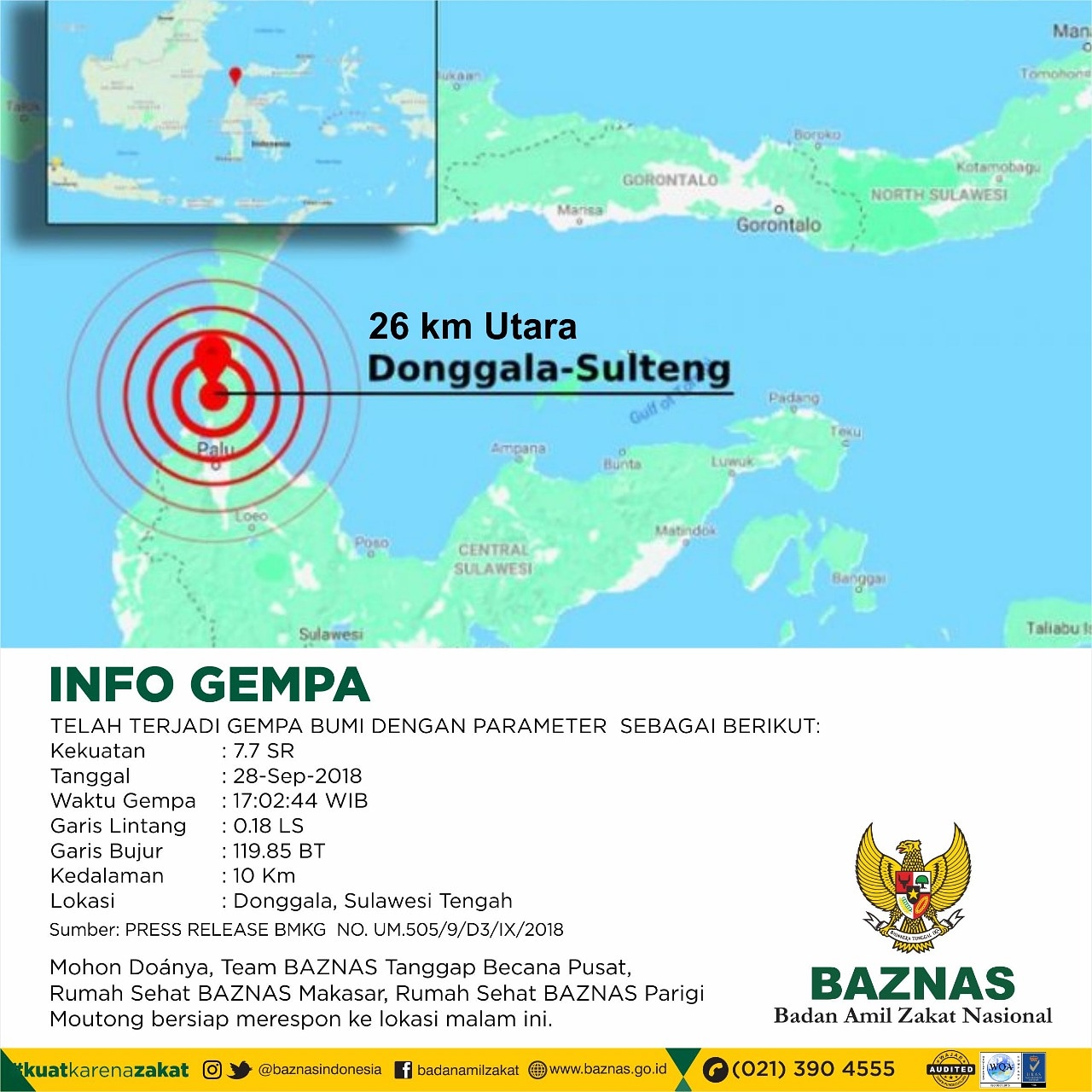 The National Zakat Board (BAZNAS) called on the zakat movement, both for BAZNAS and the Private Zakat Institution (LAZ) at the national and regional levels to help the 7.4 SR earthquake and tsunami in Palu City and Donggala Regency, Central Sulawesi.