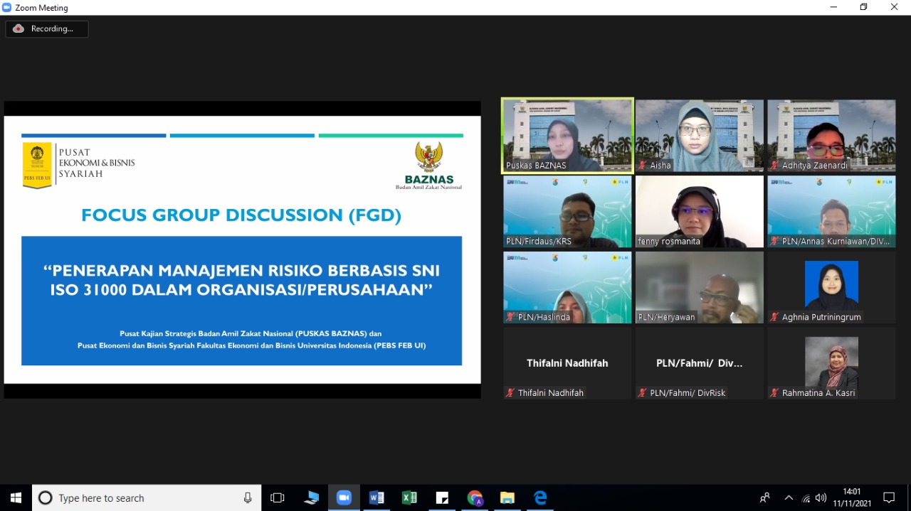 On Thursday (11/11/2021), Puskas BAZNAS has successfully held a Focus Group Discussion related to the Implementation of Risk Management Based on SNI ISO 31000 in Organizations/Companies.