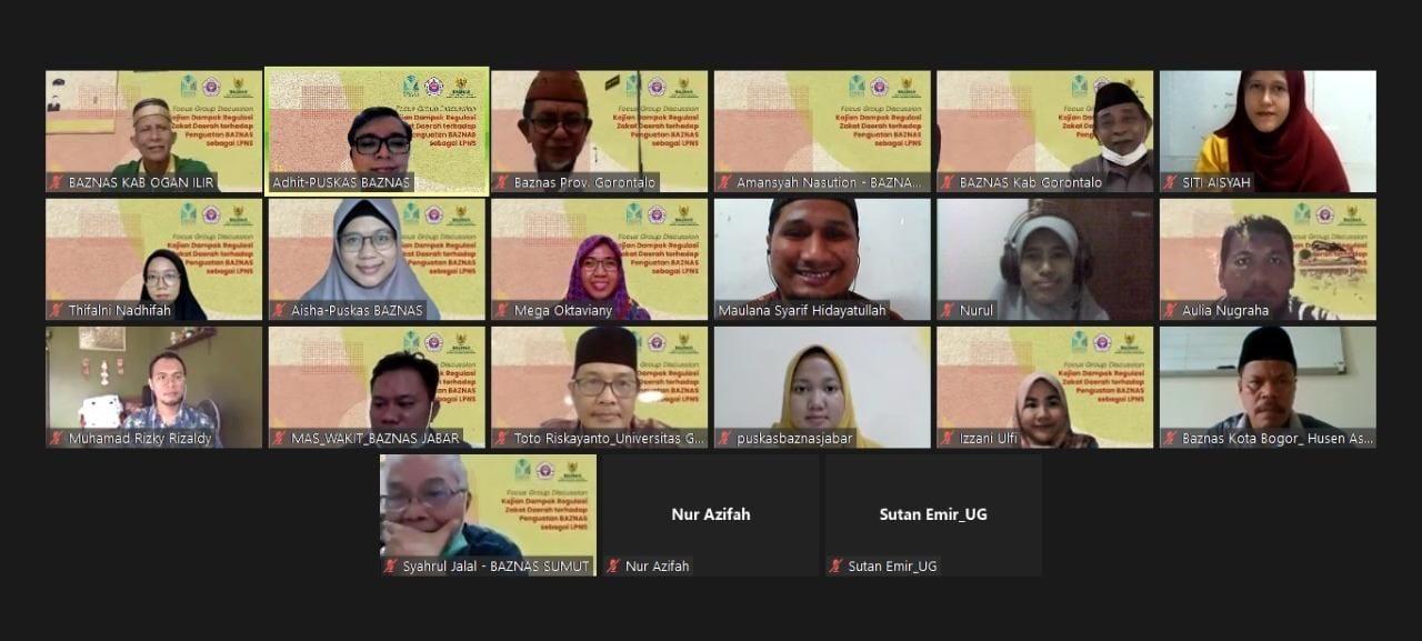 On Wednesday (22/9/21), Puskas BAZNAS successfully carried out an Online Focus Group Discussion with the theme "Study on the Impact of Regional Zakat Regulations on Strengthening BAZNAS as an LPNS".