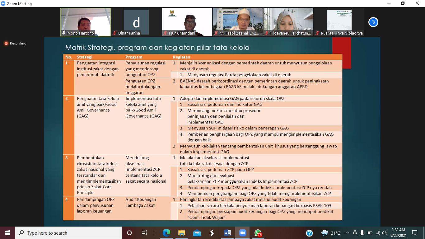 On Wednesday (22/09/2021), Puskas BAZNAS held a virtual FGD with the Division of Operations, Governance, and Institutional to discuss AZI (Indonesia’s Zakat Architecture) especially on the Institutional and Governance Pillars. The study of Indonesia’s Zakat Architecture has reached the stage of preparing the pillars. The purpose of the establishment of AZI is to become a national zakat roadmap. This discussion aims to obtain feedback and suggestions from internal practitioners of BAZNAS in order to improve AZI by strengthening and developing programs and activities that will be planned for the 2022 - 2026 period.